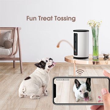 Fun Treat Tossing: Toss your dog's favorite treats with phone app, get their attention with the speaker, and play with them remotely through the treat tossing function. Let your dog experience your virtual presence even when you are not at home. Have them jump and chase treats and tell him he's a good boy!