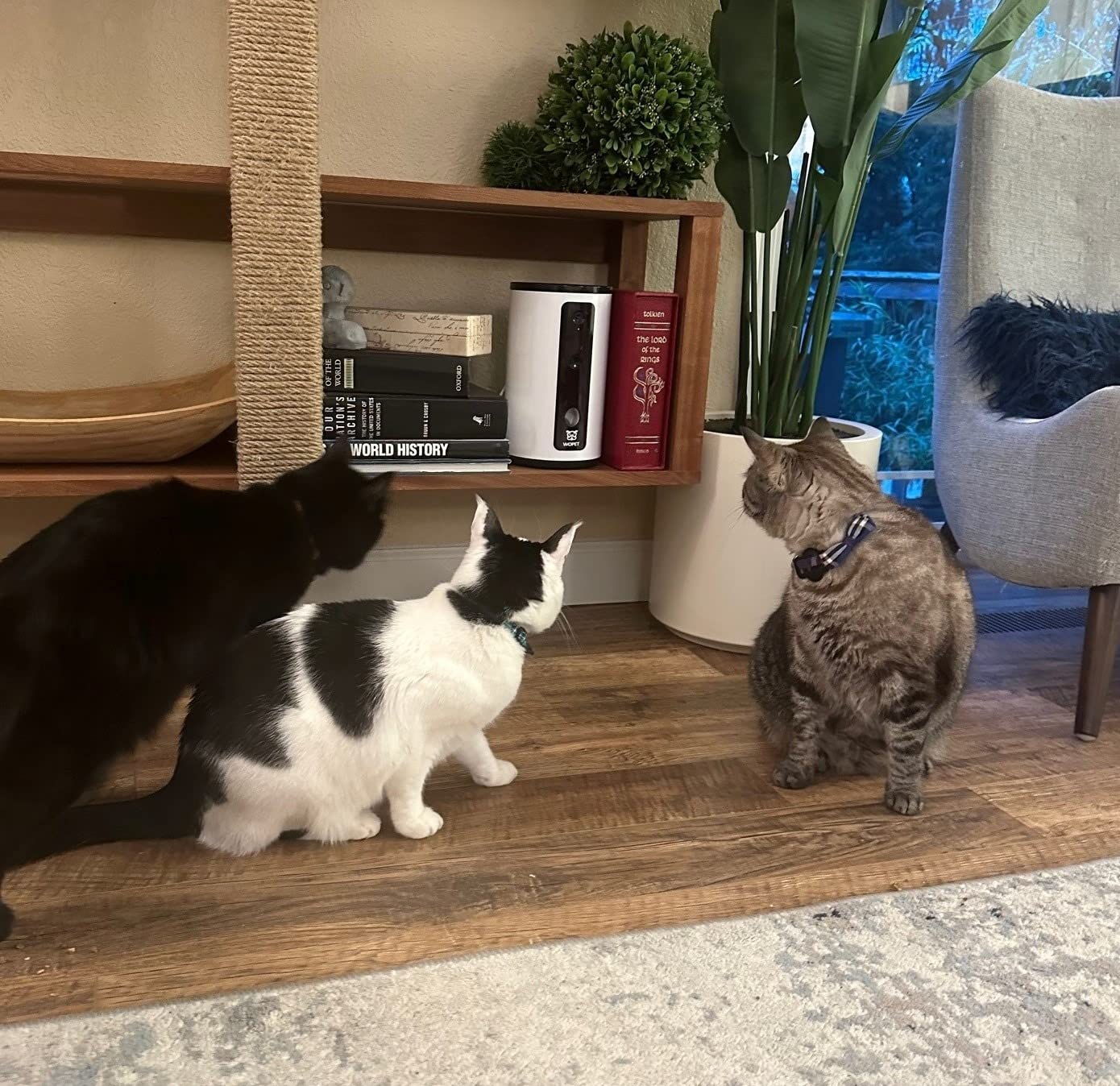 We had a Furbo for years, but my biggest cat Milo would knock it over and the lid would pop off and he'd gorge on treats. So when the power cord finally busted when he knocked it over, I went to buy a replacement, and chafed at the cost still being so high. I saw this WOPET did the same thing at like $100 less so I figured I'd try it. In (almost) all metrics, it is better: 1) It holds more treats. The Furbo has this slimline look, but the top is very thick where the unit is widest, so the chamber to hold treats is very small and empties quick. This unit holds way more, so it's better designed 2) It has suctions on the bottom to adhere to a shelf. Furbo doesn't have this (or didn't when I bought it), so was easy to knock over. This one is not immoveable, but it is hard to move. Milo hasn't been able to knock it over. 3) The lid is better designed. It's not overly thick like the bamboo one from the Furbo, and it sucks on better, It can actually be a bit hard to get off if you don't have fingernails to get in the crack to start the pulling. Milo hasn't gotten the lid off, which is good, because he doesn't need too many treats, he could lose a pound or two so we have to be sparing with the treats and not let him overdo it. 4) Camera quality is better. At least from my Furbo bought a few years back, so perhaps Furbo has d their camera too. 5) It has a button on it so you can dispense without having to open the app. Sometimes you want to give your cats a treat with it without dealing with the app. Or you want the cat sitter to be able to dole out treats and don't want to give them app access. This is better than having no button. 6) It's way cheaper. It does all the same things (at least that I use it for), and way less money. 7) It doesn't show a different light when you are on the camera. With the Furbo, if you're looking at the unit it has one color of light on for if it is on standby and another color of light when the app is open and the camera is on. For me, I want there not to be a color difference. I want to also use this camera to spy on what's going on in my house when I am not there with the teenagers in the living room. With the Furbo they could tell when I'm doing that. With the WOPET they cannot. 8) The ONLY thing I wish they'd done differently is put the power cord input on the back, rather that on the side that makes it hard to put books right next to it on the shelf. It's not quite as slick looking as the Furbo, but it's fine. The curved sides of the Furbo didn't make it a great book end either. (By the way, my pic above is of our custom designed bookshelf/kitty tree we designed. So it's a whole kitty playground, with some functionality too, which is why it looks so sparse.)